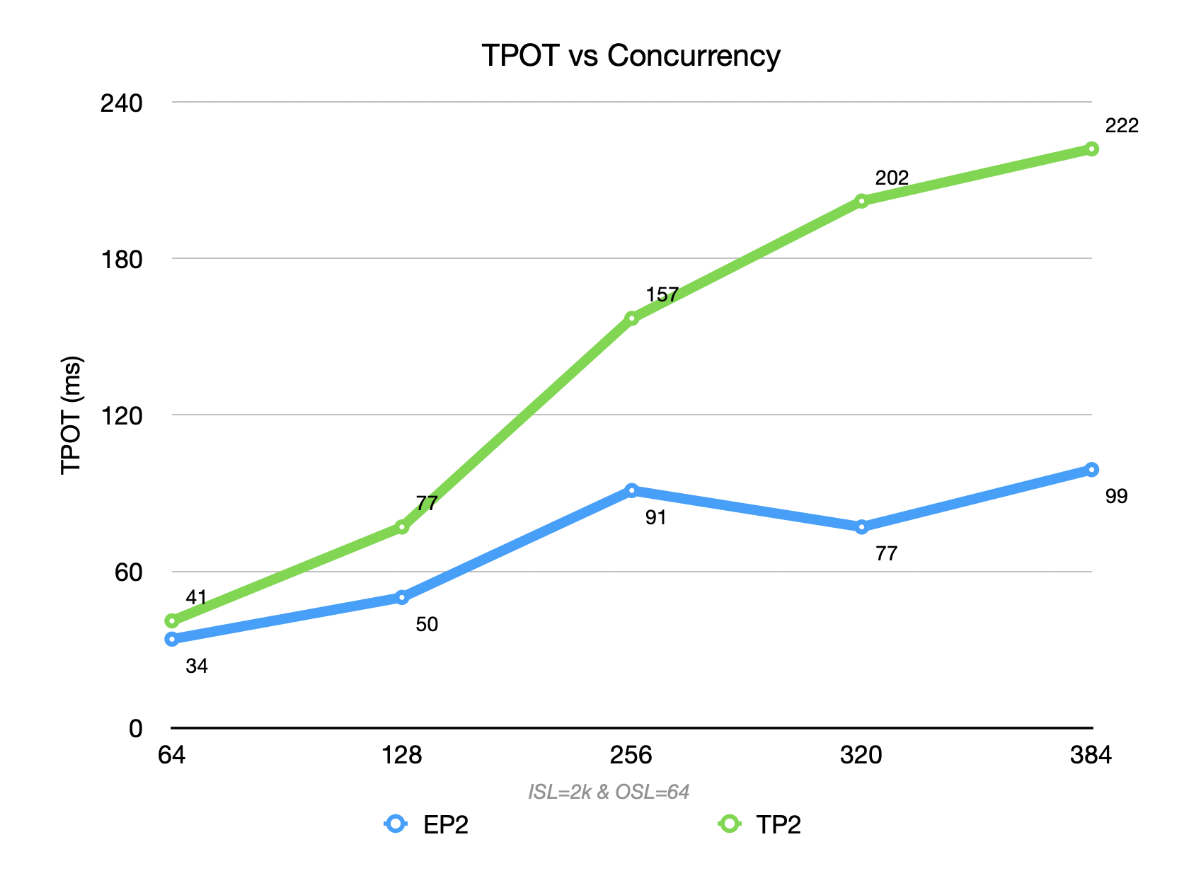 TP2is recommended, to prevent excessive attention-layer latency from crowding out GPU time in the decode phase. - In contrast, for output-heavy case, the TPOT advantage of