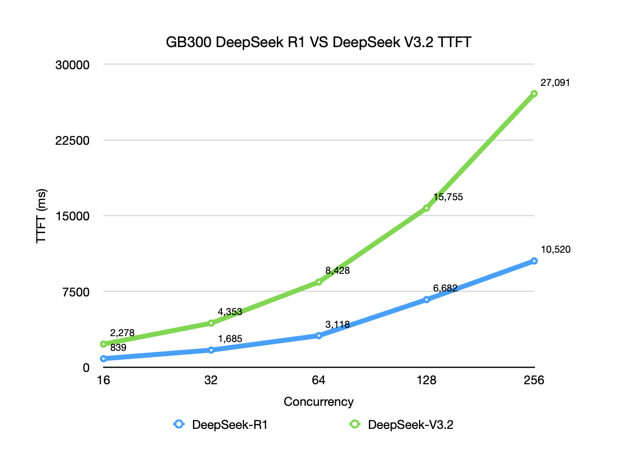 As shown in the chart below, with the same GB300 setup, DeepSeek R1's Prefill throughput capability is ~ 3x that of DeepSeek V3.2.