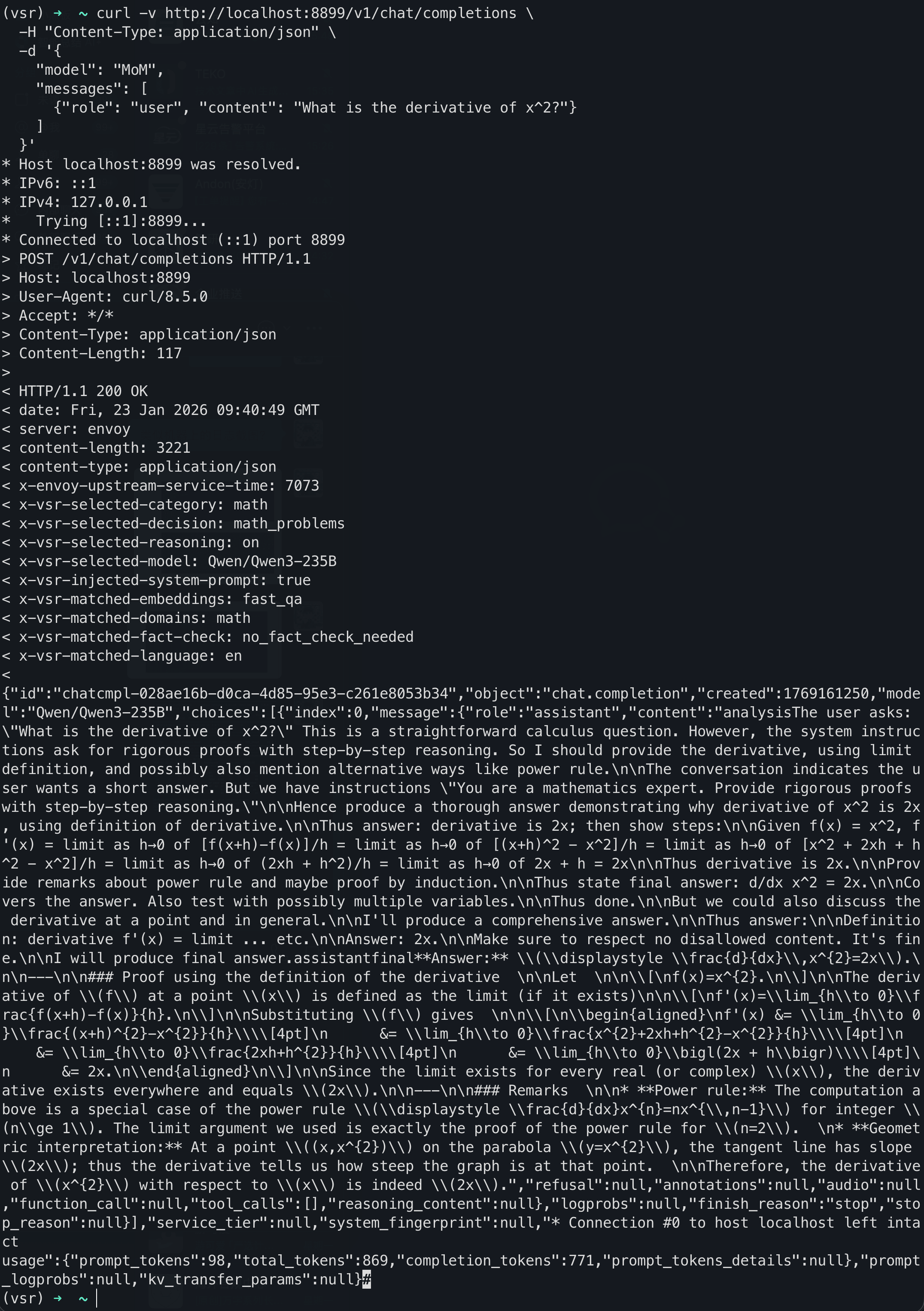 With vLLM Semantic Router (vLLM-SR) v0.1, we've deployed a live MoM system on AMD MI300X/MI355X GPUs that demonstrates these capabilities in action—routing queries across 6 specialized models using 8 signal types and 11 decision rules with the performance boost.