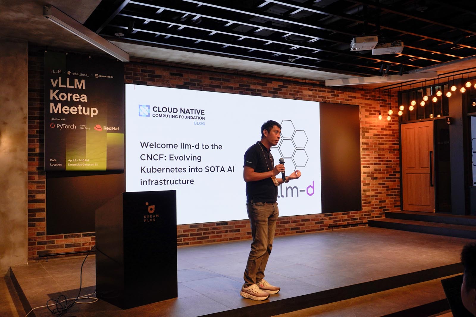 The meetup opened with Dr. Hongseok Kim from Rebellions and Li Ming from Red Hat APAC sharing the latest vLLM project updates and community news.