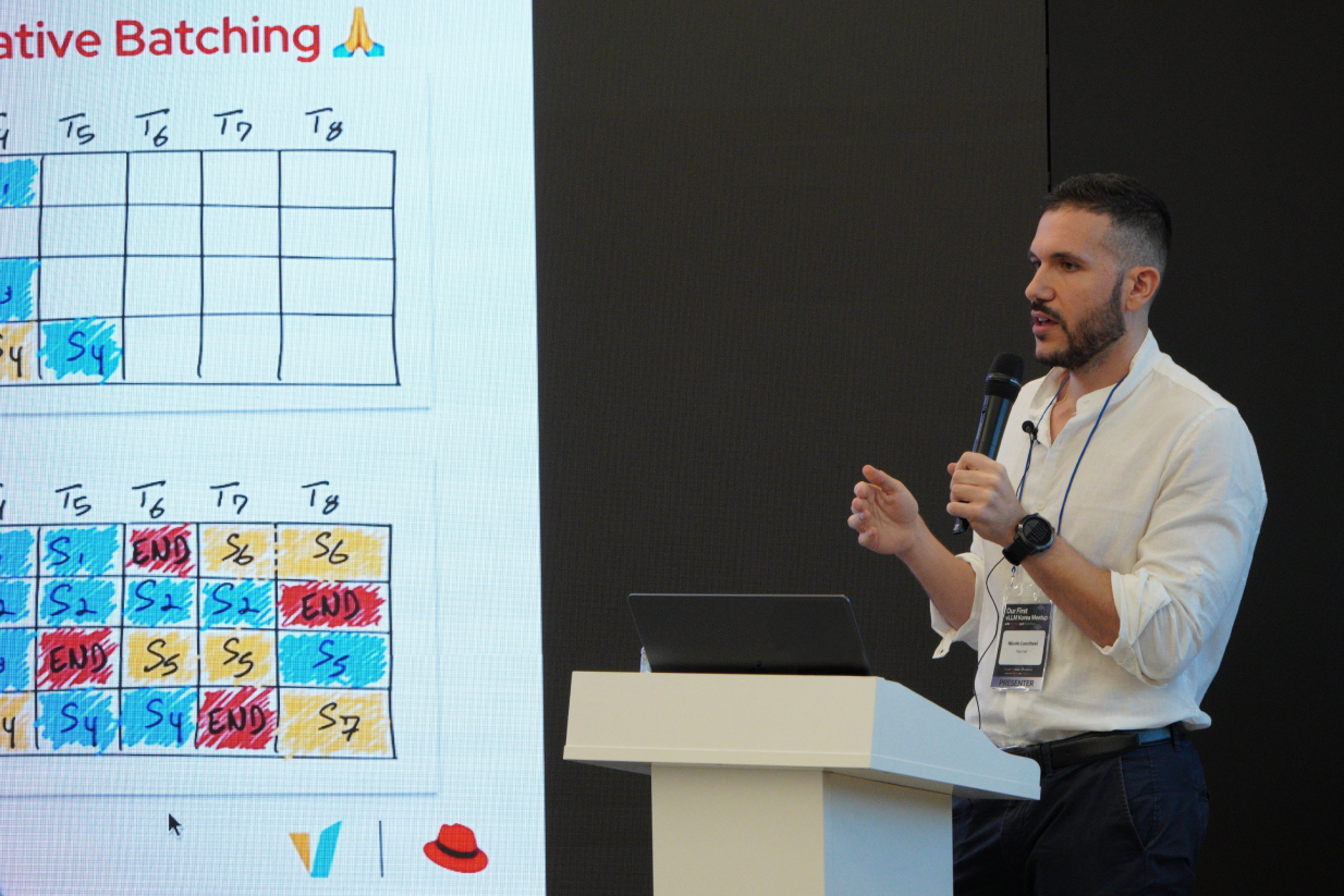 Nicolò Lucchesi, Senior ML Engineer at Red Hat, opened the event by highlighting the original innovation behind vLLM — solving long-standing challenges in KV caching and dynamic batching with a novel paged attention architecture. He emphasized that “modern problems require traditional solutions,” noting that the exact challenges in scheduling and memory management had already been tackled in operating systems, and vLLM simply applies the same proven ideas to AI inference.